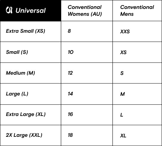Resting is designed for real people, real movement, and real life — with a unique Universal Fit guide that puts comfort first. Find your usual size in the chart, then match it to your Resting Universal size for a fit that feels like you.